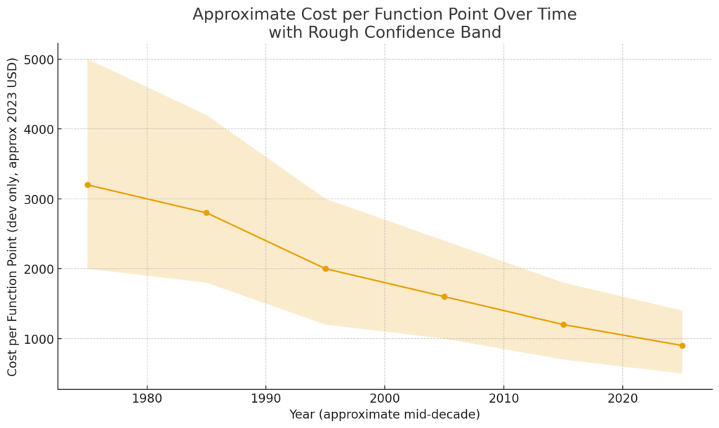 Software companies have also tracked & published data around their own function points, so we have some reference as to how this has evolved over time. While there’s no comprehensive data source created, we can still derive a rough approximation of cost per function point over time, since the 70s.